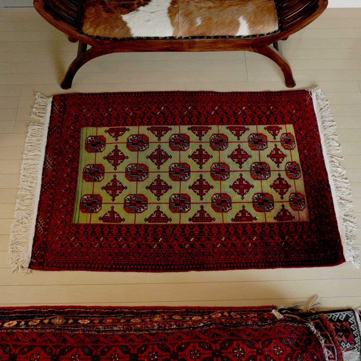 人気のトルクメンラグが入荷です。経年変化で深みを増したグリーンと赤のコントラストが美しい1枚です。扱いやすい薄めのラグで、オールシーズン気持ちよくお使い頂けます。